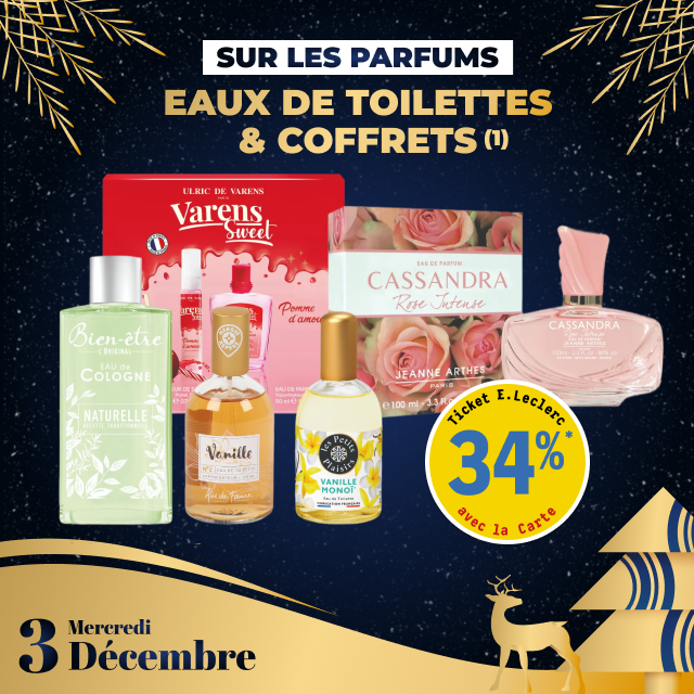 (1) Hors marques Laurence Dumont et Pur Eden, et coffrets des marques Les Petits Plaisir; Bondepil et Marvel *carte 100% gratuite et disponible immédiatement. Offre non cumulable avec des produits de la même gamme bénéficiant d’une autre promotion. Bon d’achat réservé aux porteurs de la carte E.LECLERC, sur présentation en caisse de la carte E.LECLERC et valable dès le lendemain de son obtention, cumulable sur la carte E.LECLERC et utilisable sur tous les produits de l’ensemble des E.LECLERC participant au programme de fidélité. Les offres béneficiant d’un Ticket E.LECLERC sont limitées à 15 produits par foyer par opération. Offre réservée à une consommation personnelle. Le magasin se réserve le droit de refuser toute demande d’une quantité supérieure aux besoins habituels généralement constatés pour une consommation personnelle. Offre interdite à la revente.