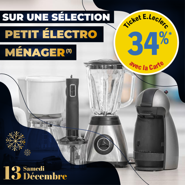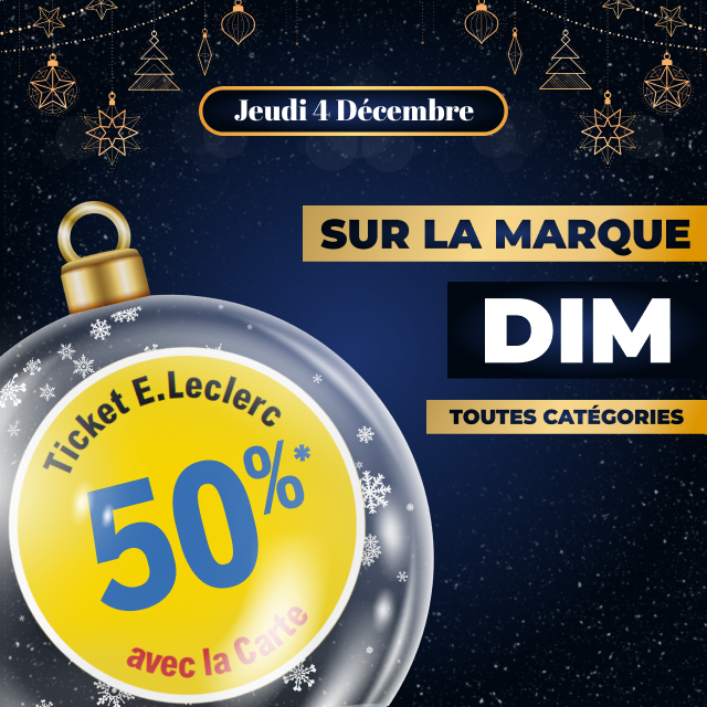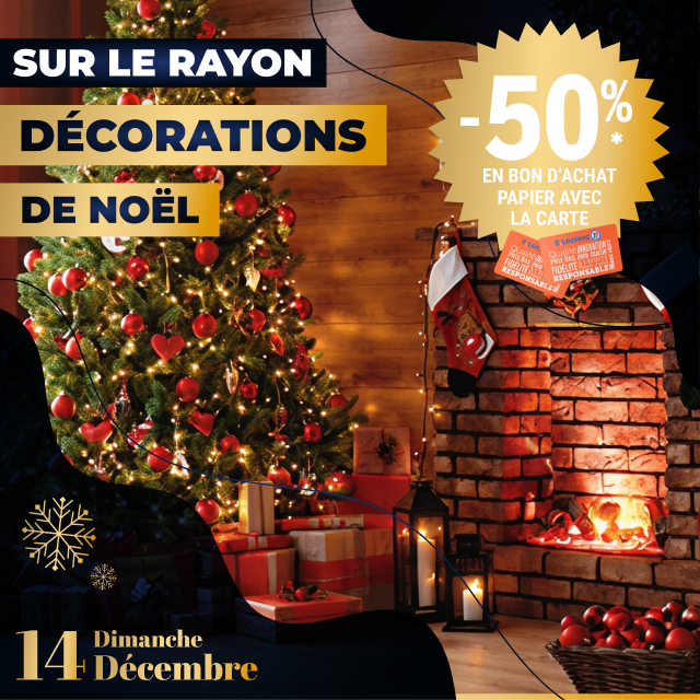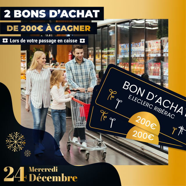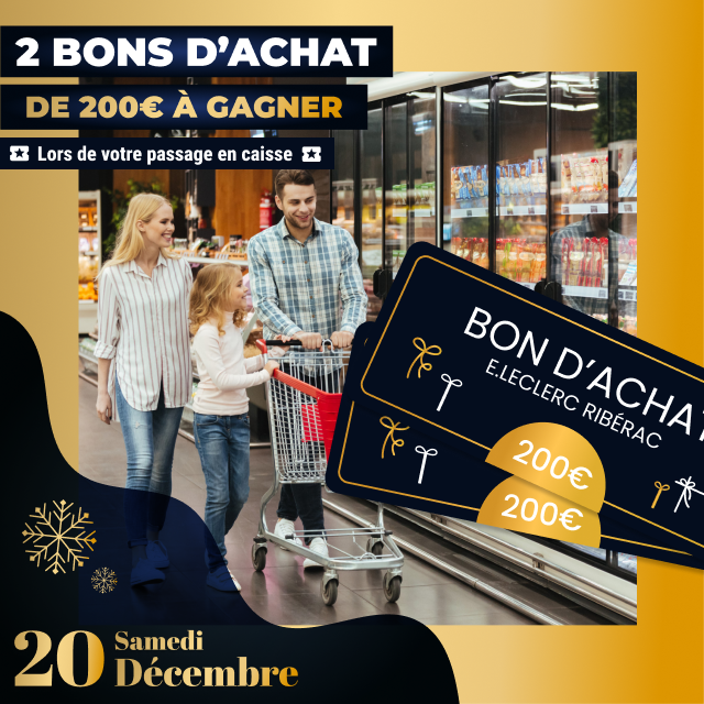 *Jeu gratuit avec obligation d’achat d’une montant minimum de 50€.Un bon d’achat de 200€ mis en jeu de 8H30 à 13H et un deuxième de 13H à 19H30. Carte 100% gratuite et disponible immédiatement. Bon d’achat réservé aux porteurs de la carte E.LECLERC, sur présentation en caisse de la carte E.LECLERC et valable du 21 Décembre au 31 Décembre 2025, utilisable pour un montant égal ou supérieur à la valeur du bon, pour tout achat hors manège à Bijoux, Billetterie, Station service, jeux de la française des jeux et Drive. Bon non cessible, non transmissible, non remboursable, pas de rendu monnaie, valable uniquement avec la carte de fidélité afférente. Règlement complet sur demande ou disponible à l’accueil de votre magasin.