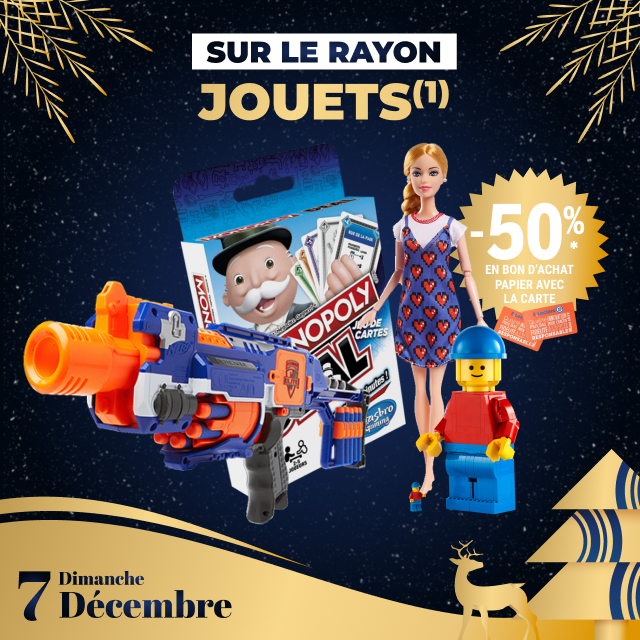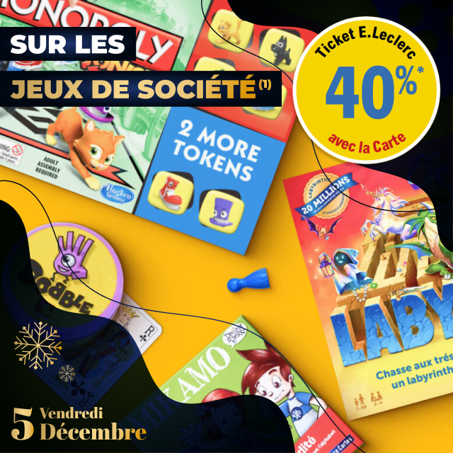 (1) Hors console de jeux et jeux de console, cycle et jeux d’extérieur *carte 100% gratuite et disponible immédiatement. Offre non cumulable avec des produits de la même gamme bénéficiant d’une autre promotion. Bon d’achat réservé aux porteurs de la carte E.LECLERC, sur présentation en caisse de la carte E.LECLERC et valable du 08 Décembre au 31 Décembre 2025, utilisable pour un montant égal ou supérieur à la valeur du bon, pour tout achats hors manège à Bijoux, Billetterie, Station service, jeux de la française des jeux et Drive. Bon non cessible, non transmissible, non remboursable, pas de rendu monnaie, valable uniquement avec la carte de fidélité afférente. Les offres bénéficiant d’un Bon d’achat E.LECLERC sont limitées à 15 produits par foyer par opération. Offre réservée à une consommation personnelle. Le magasin se réserve le droit de refuser toute demande d’une quantité supérieure aux besoins habituels généralement constatés pour une consommation personnelle. Offre interdite à la revente.